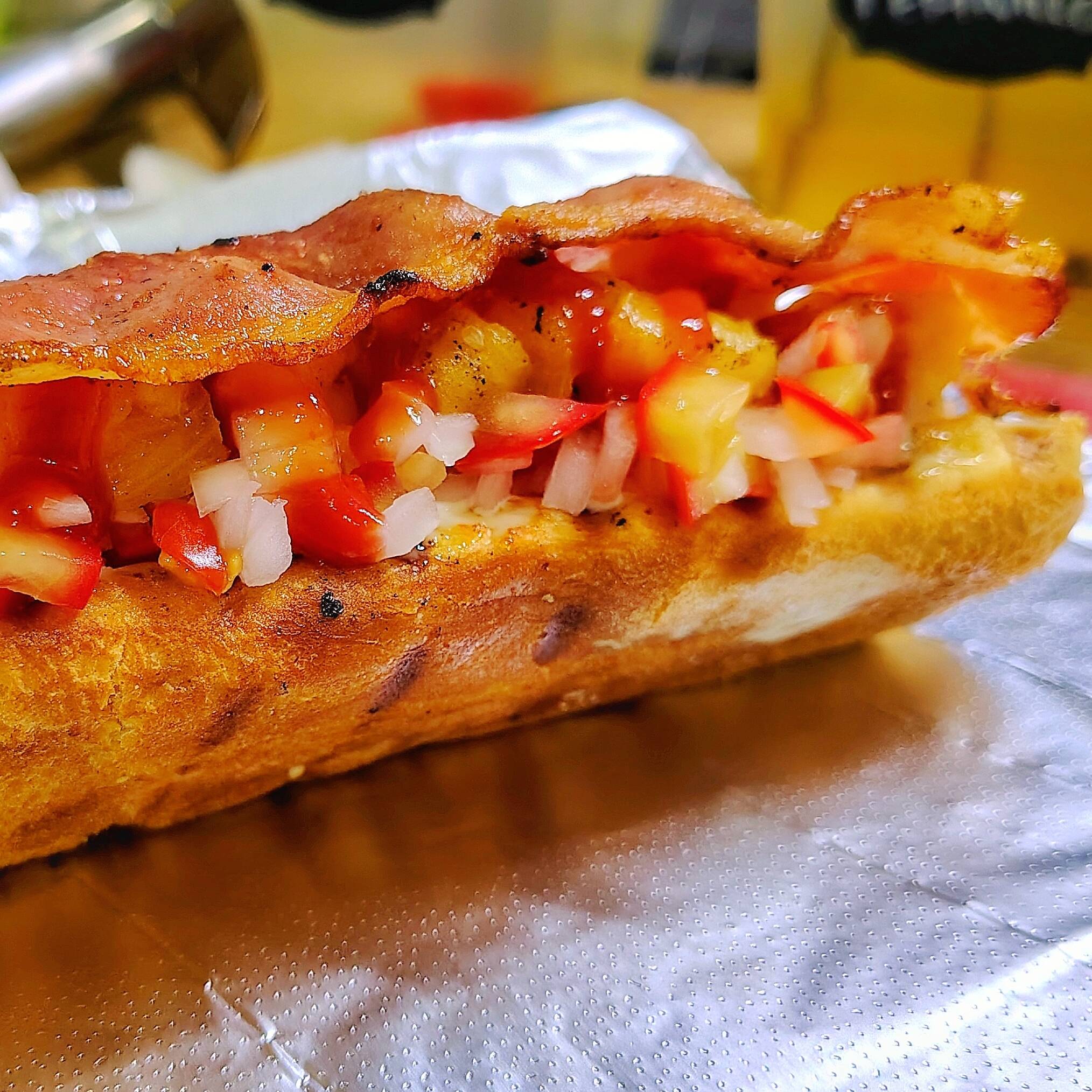 Salchicha, tocino y piña.