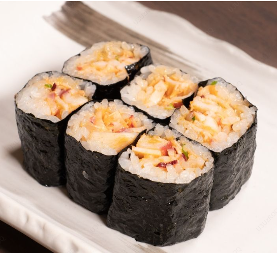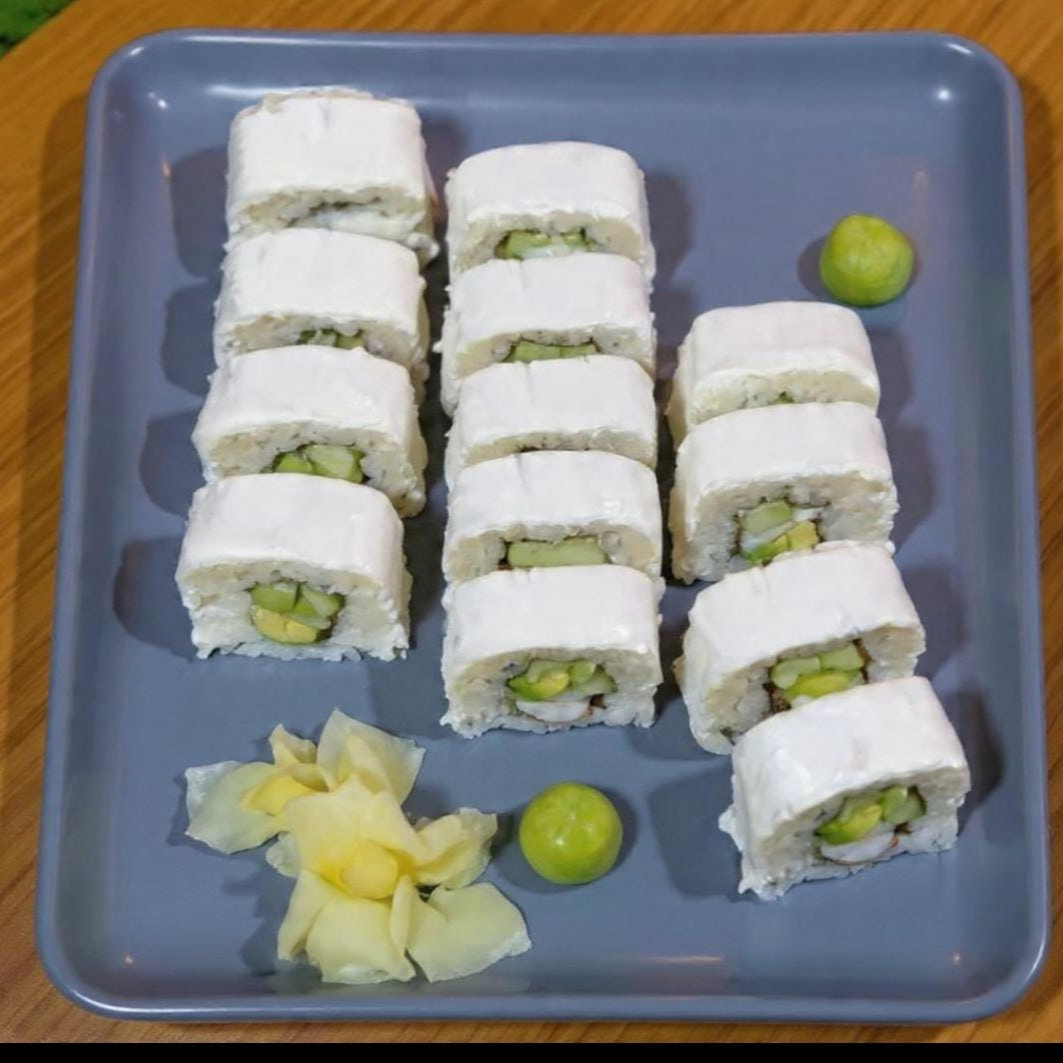 Rollo de sushi con queso philadelphia, aguacate, zanahoria y pepino, envuelto en arroz japonés al vapor y alga nori.