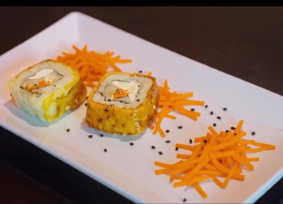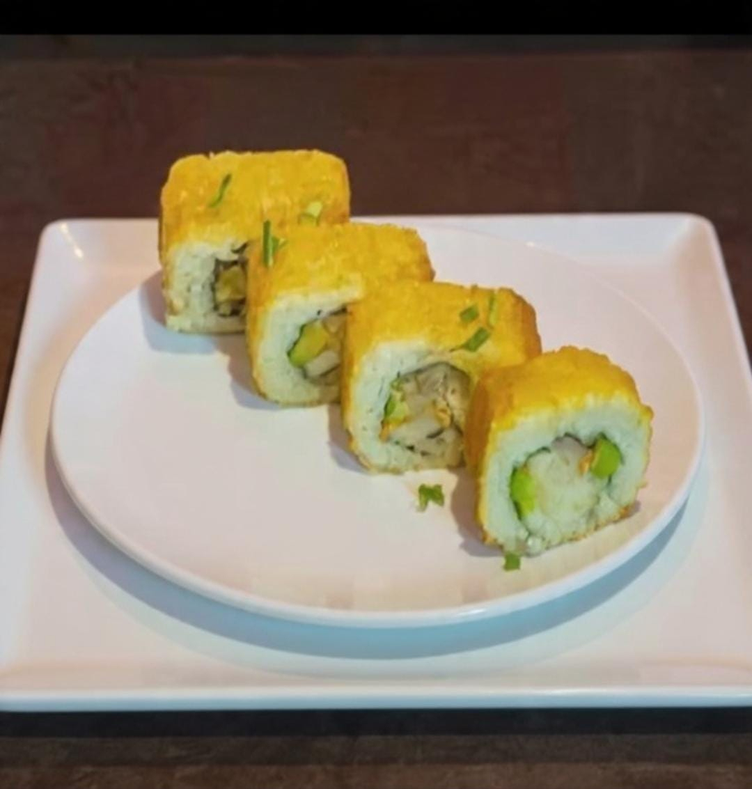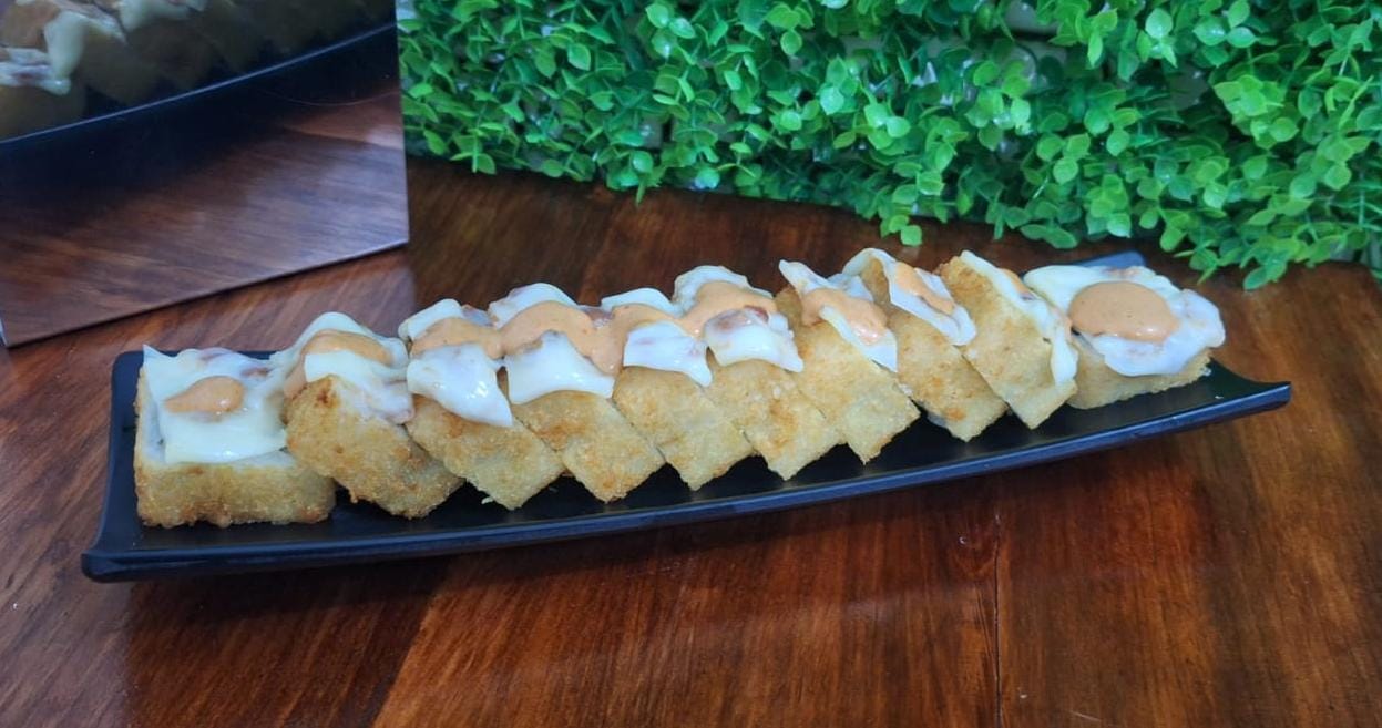 Empanizado de queso philadelphia y surimi con aguacate camarón y sushi.
