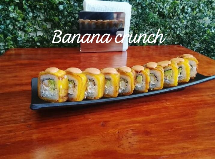 Plátano maduro frito con camarón empanizado, queso philadelphia y aguacate.