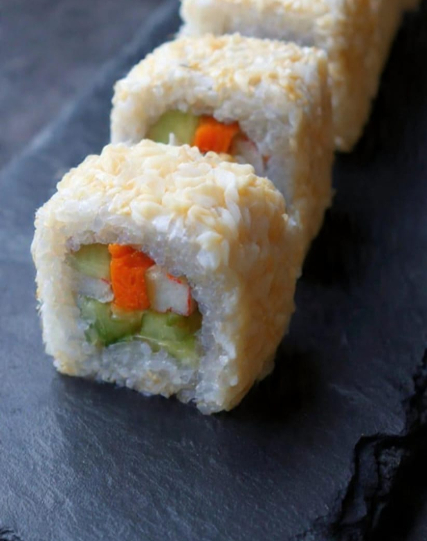 surimi, zanahoria, pepinos y cubierta de ajonjoli