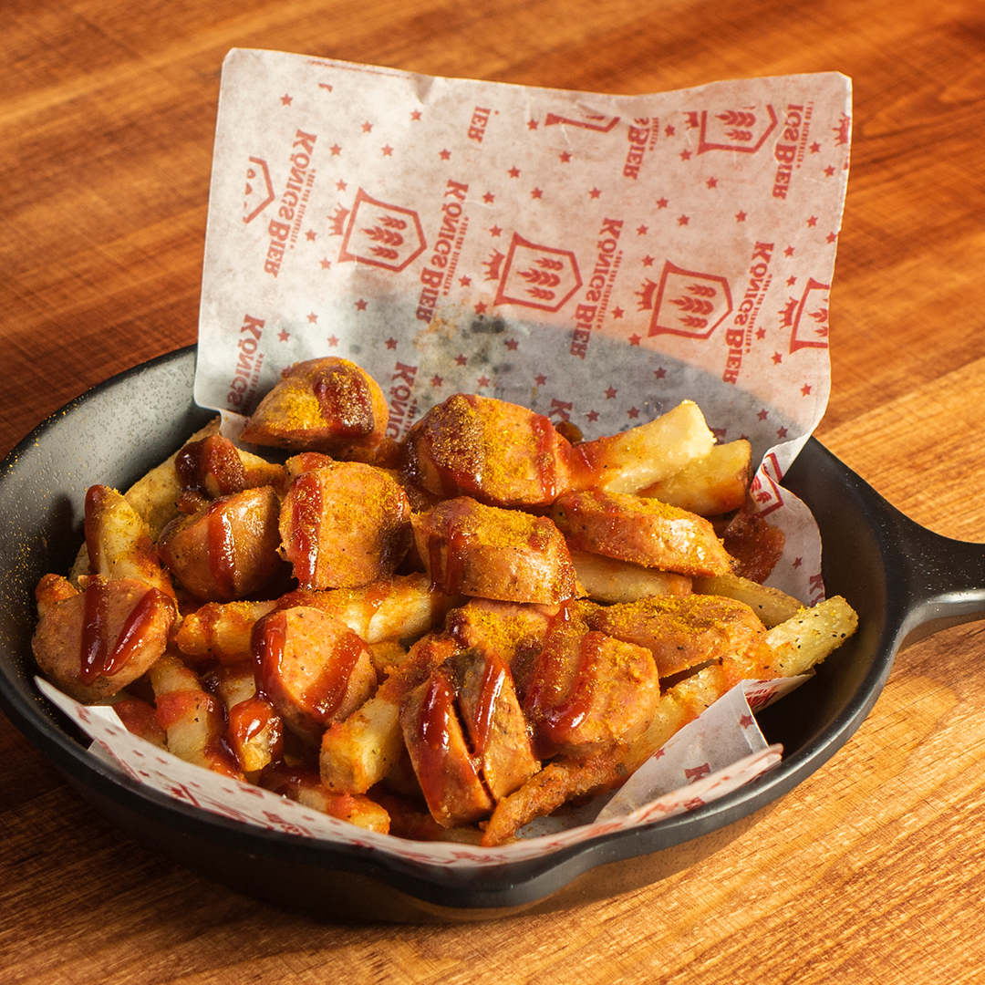Cama de patatas fritas con salchicha Currywurst en rodajas bañada con una salsa a base de tomate, bbq ahumada y polvo curry.