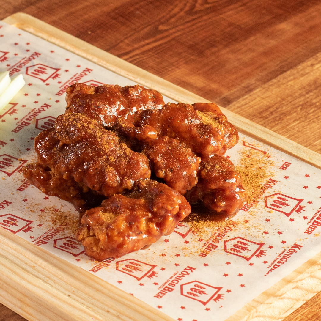 Suaves trocitos de pechuga de pollo empanizados, dorados a la perfección y bañados en cualquiera de nuestras deliciosas salsas