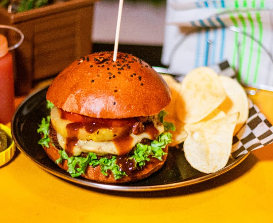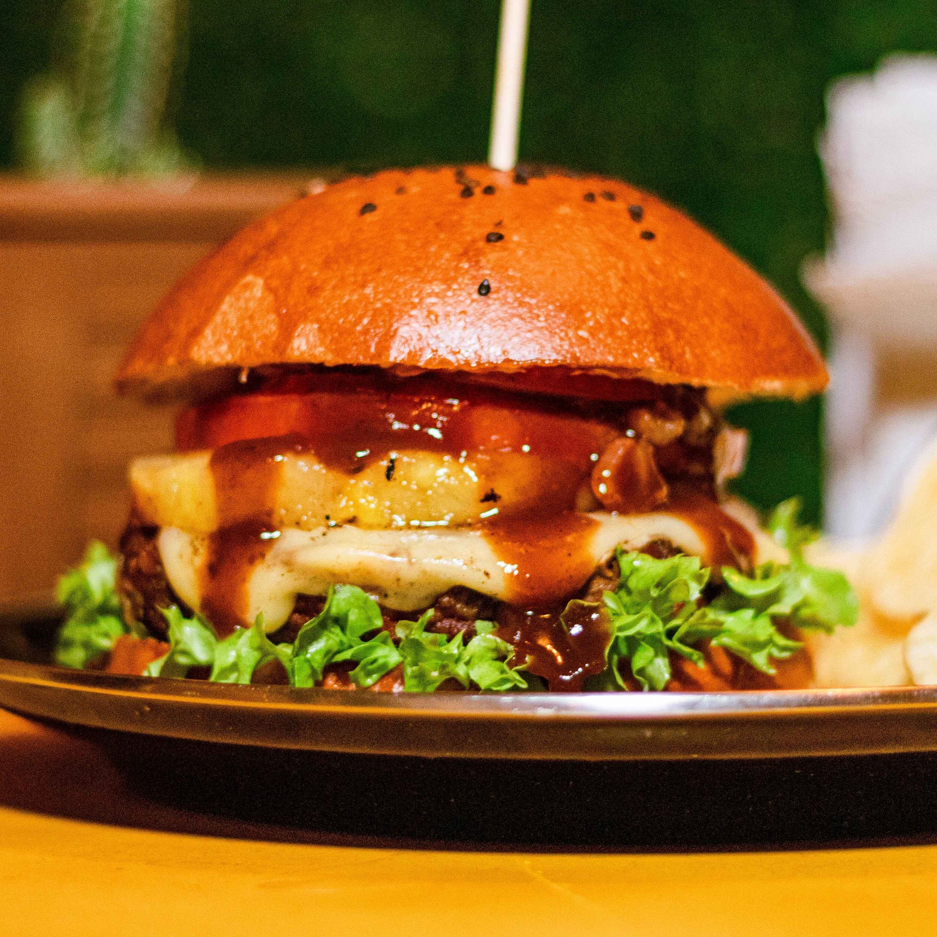 Pan brioche, carne angus, queso manchego, lechuga italiana, tomate bola, cebolla morada, pepinillos, mermelada de tocino, piña ahumada bañada en salsa BBQ.