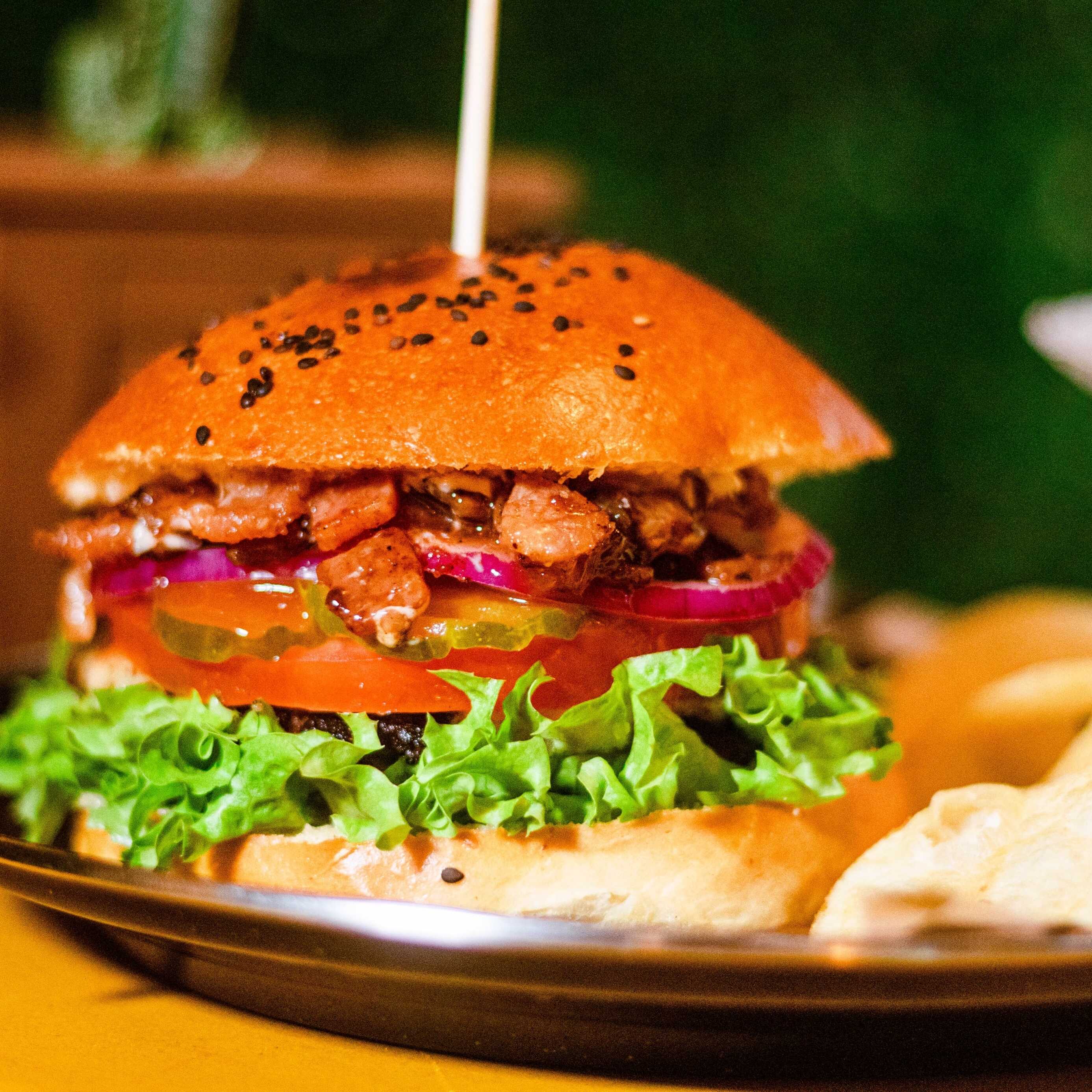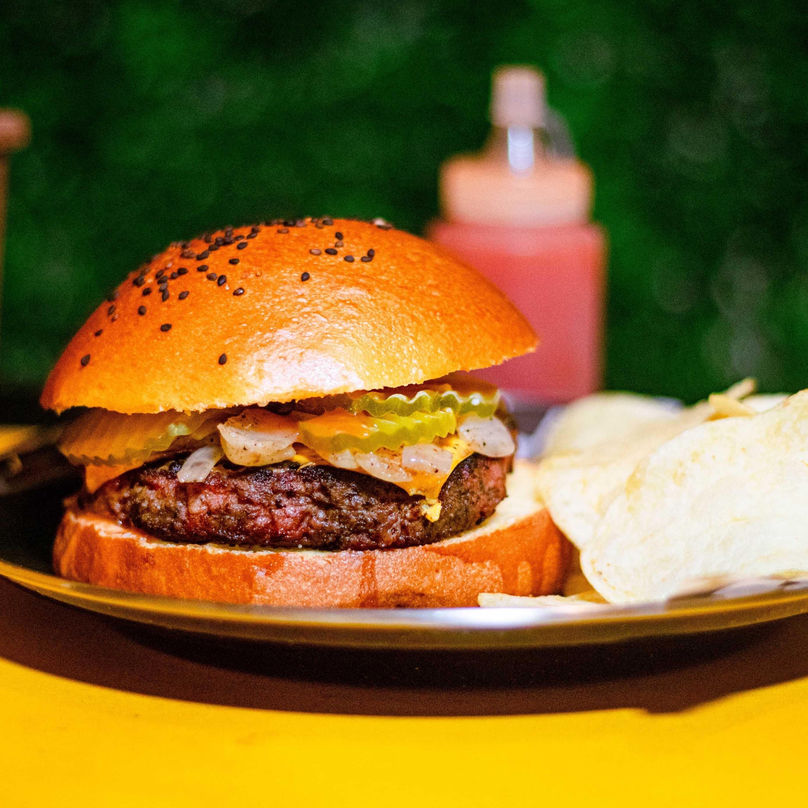 Pan brioche, carne angus, queso manchego, lechuga italiana, tomate bola, cebolla morada, pepinillos y mermelada de tocino