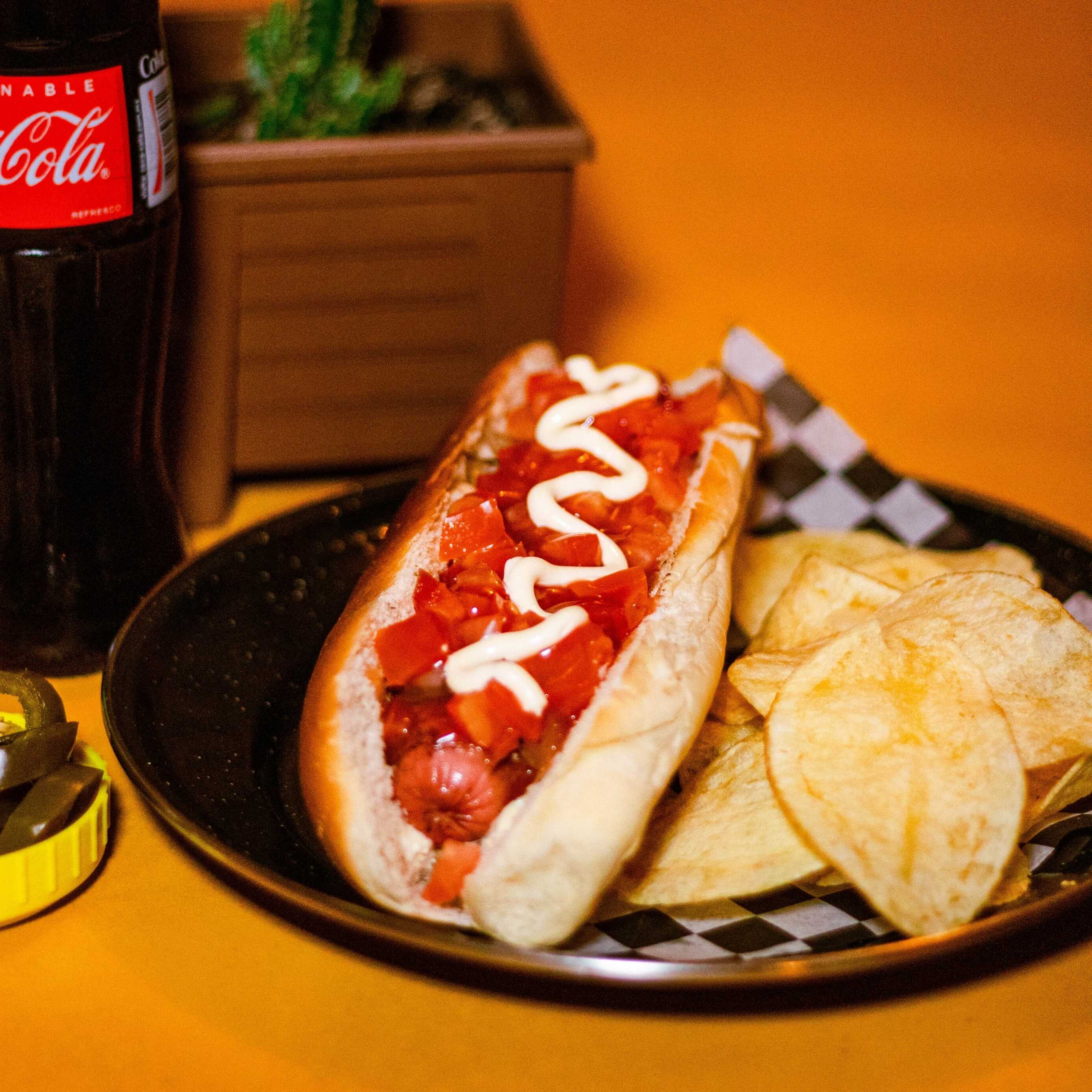 Pan jumbo brioche, salchicha jumbo de la casa, cebolla, tomate y mermelada de tocino,