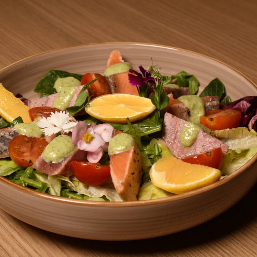 Atún fresco con marinado especial sobre cama de lechugas aderezadas, tomate cherry, aguacate asado y cebolla morada.