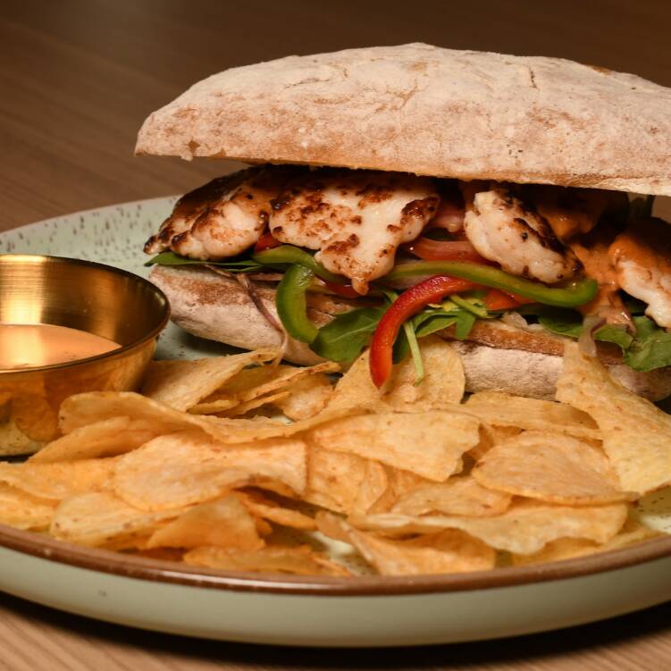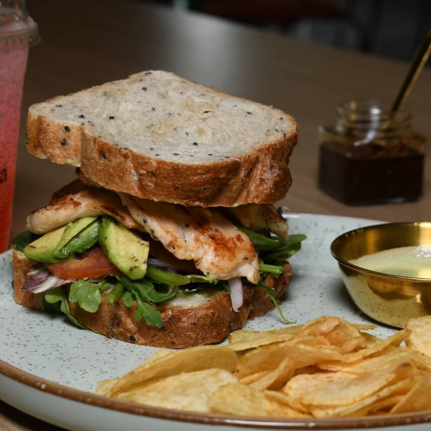 Pan ciabatta de masa madre, 150 gr de pollo asado en finas hierbas, tomate, pepino, cebolla morada, queso gouda, mix de lechugas, aderezo chipotle y aderezo de la casa.