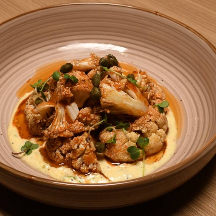 Floretes de coliflor fritos bañados en salsa búffalo de la casa con toques de especias italianas servidos en una base de aderezo de la casa y alcaparras.