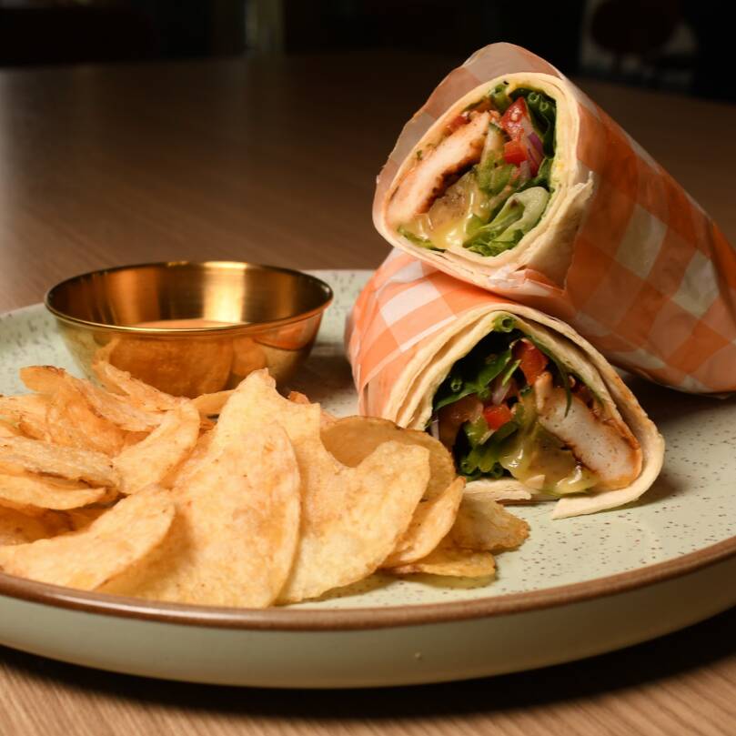 Pollo asado a las finas hierbas y salsa buffalo, queso gouda, tocino, tomate, pepino, aguacate, cebolla morada, mix de lechugas envuelto en tortilla de harina, aderezo de la casa y aderezo chipotle.