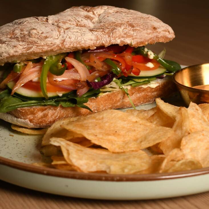 Pan ciabatta de masa madre con mix de pimientos y cebolla salteados, tomate, pepino, queso de cabra y queso gouda con aderezo limón de la casa.