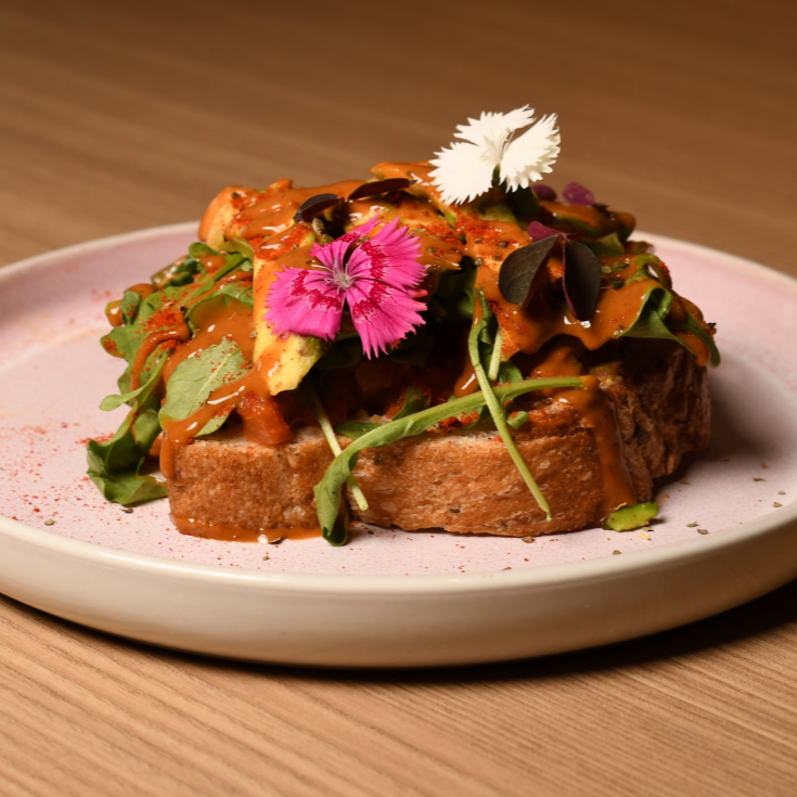 an de masa madre tostado cubierto con finas láminas de aguacate y aderezo de la casa, huevo duro, crujiente tocino con toques frescos de tomate cherry y ajonjoli.