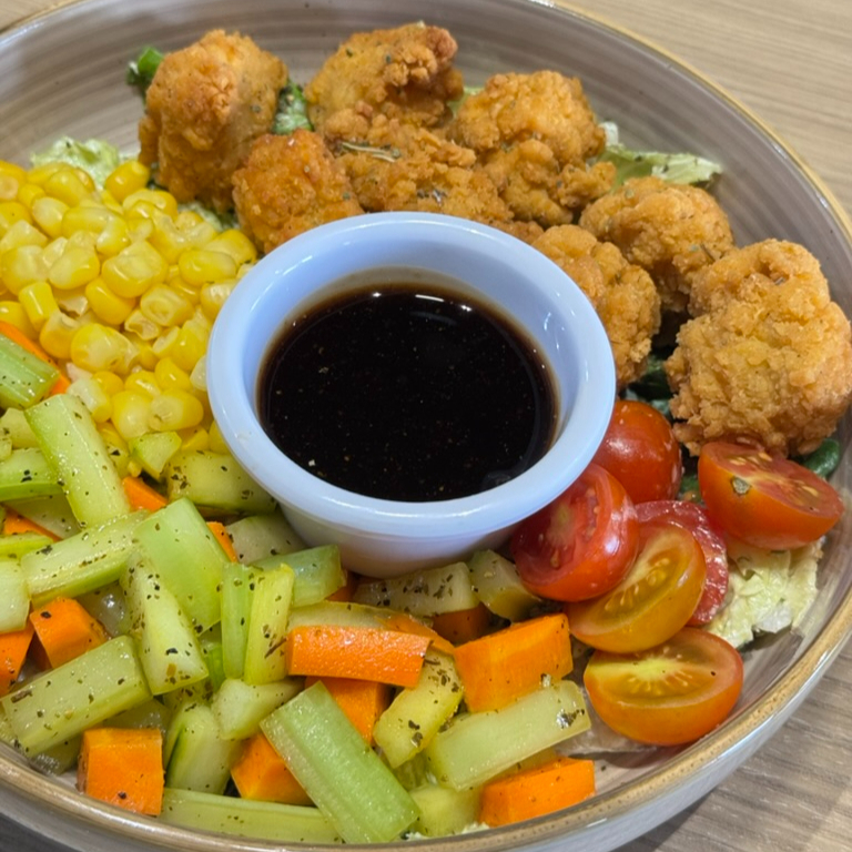 Mix de lechugas con aderezo de la casa, bites de pollo empanizado, elotitos amarillos, tomate cherry, pepino y cubos de apio y zanahoria salteados con un toque de aderezo de limón.