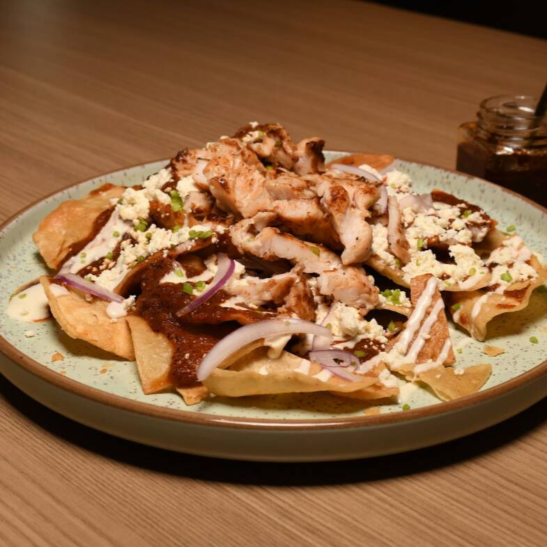 Chilaquiles en salsa roja cremosa con pollo a la plancha o huevos estrellados.