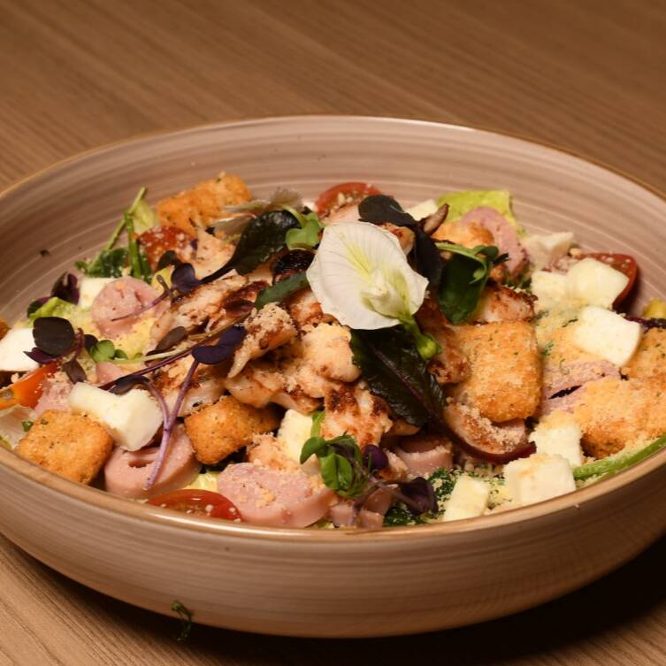 Mix de lechugas, pollo a las finas hierbas a la plancha, queso panela, elolitos, queso parmesano, crutones y aderezo de la casa.