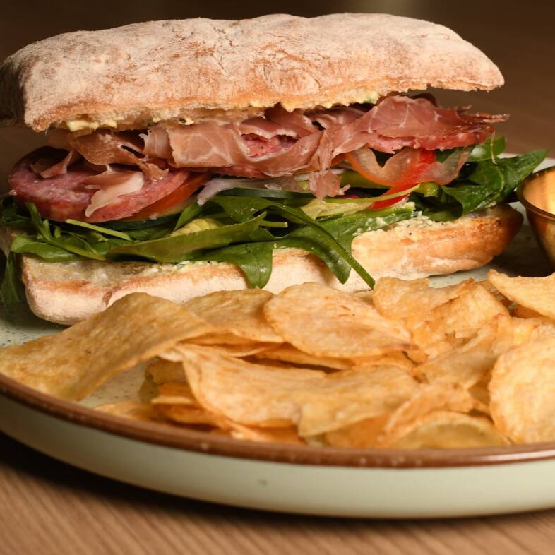 Pan ciabatta de masa madre con jamón serrano, salami, queso gouda, tomate, espinaca y aderezo de la casa.