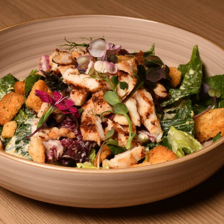 Mix de lechugas, pollo a las finas hierbas a la plancha bañada en aderezo César de la casa y crutones.