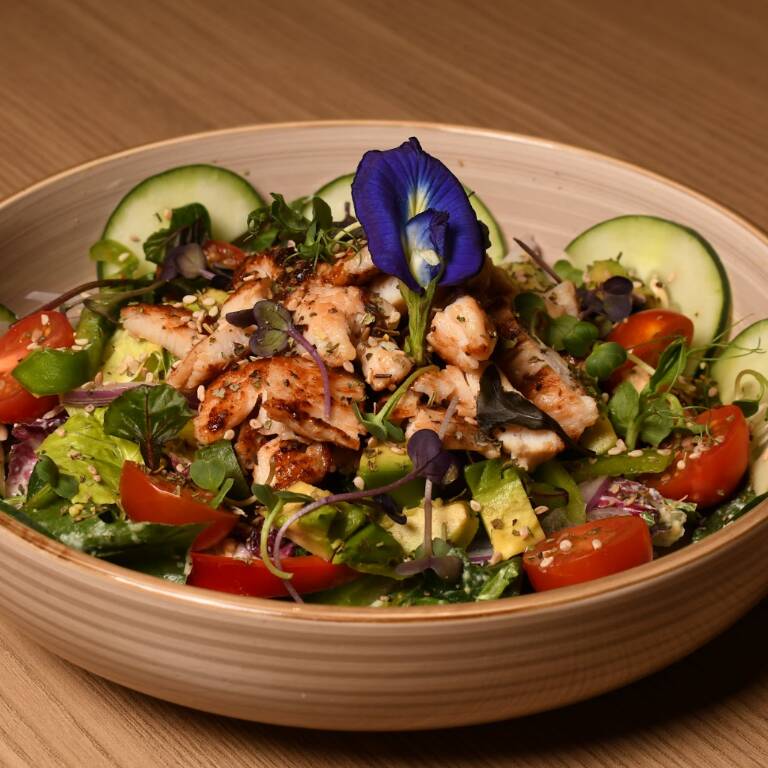 Mix de lechugas acompañadas de pollo al limón a la plancha, tomate, pepino, cebolla morada, aguacate, ajonjolí, queso parmesano y aderezo de la casa.