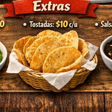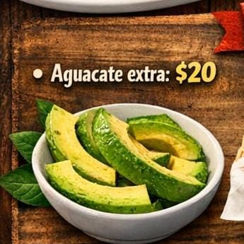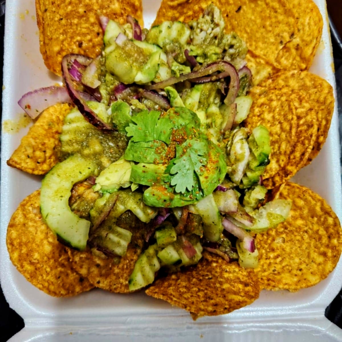Camarón Fresco, Aguacate. Cebolla, Pepino, salsas Verdes, cilantro y especias