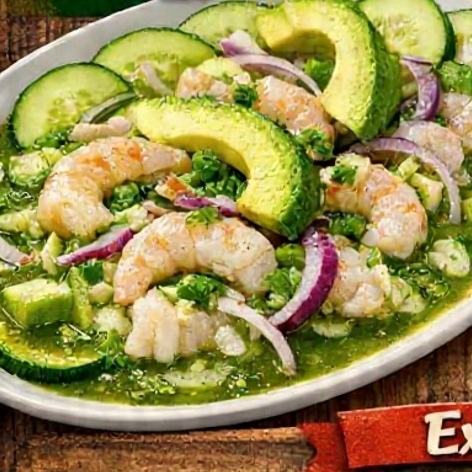 Delicioso camarón fresco curtido en limón con salsa verde de chile serrano, pepino, cebolla morada y cilantro. Servido frío con rodajas de pepino y aguacate.