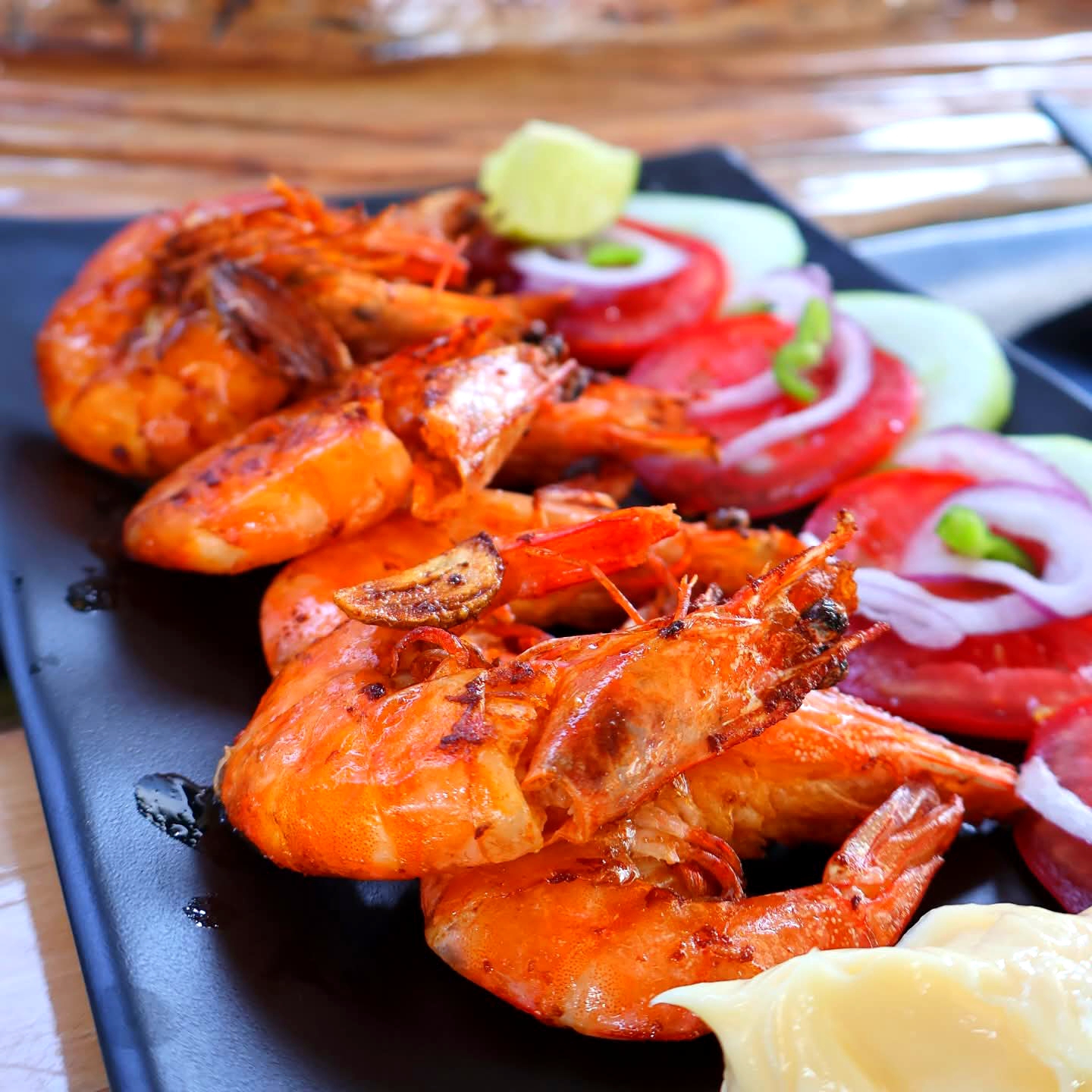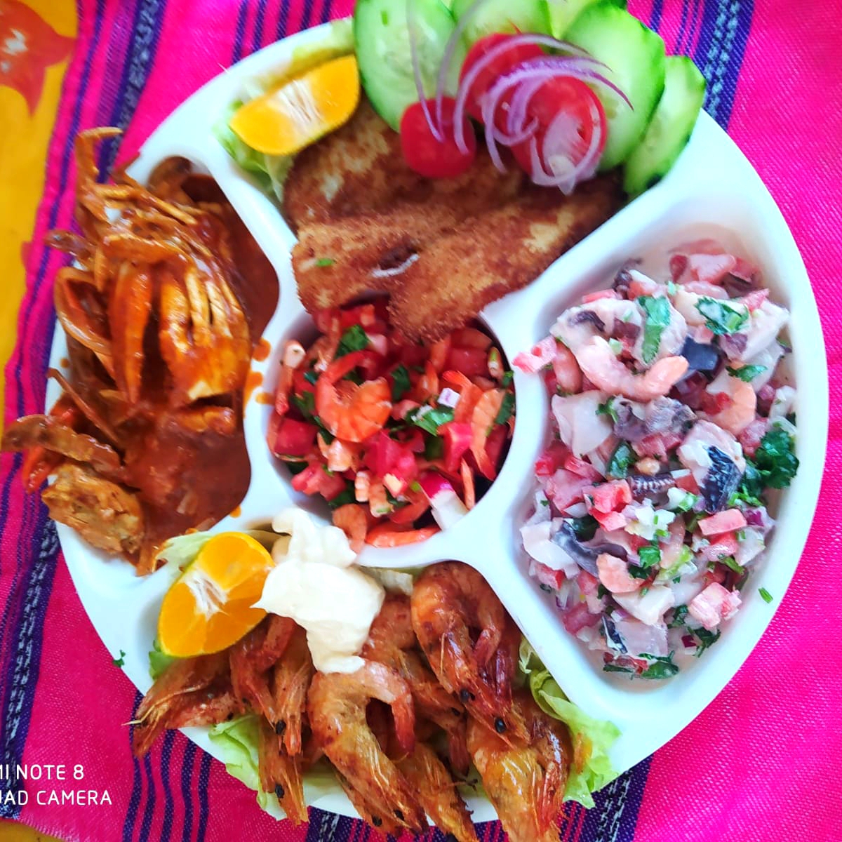 Ensalada de camarón, camarones al mojo, jaiba en chimpancho, mojarra frita y macabil
