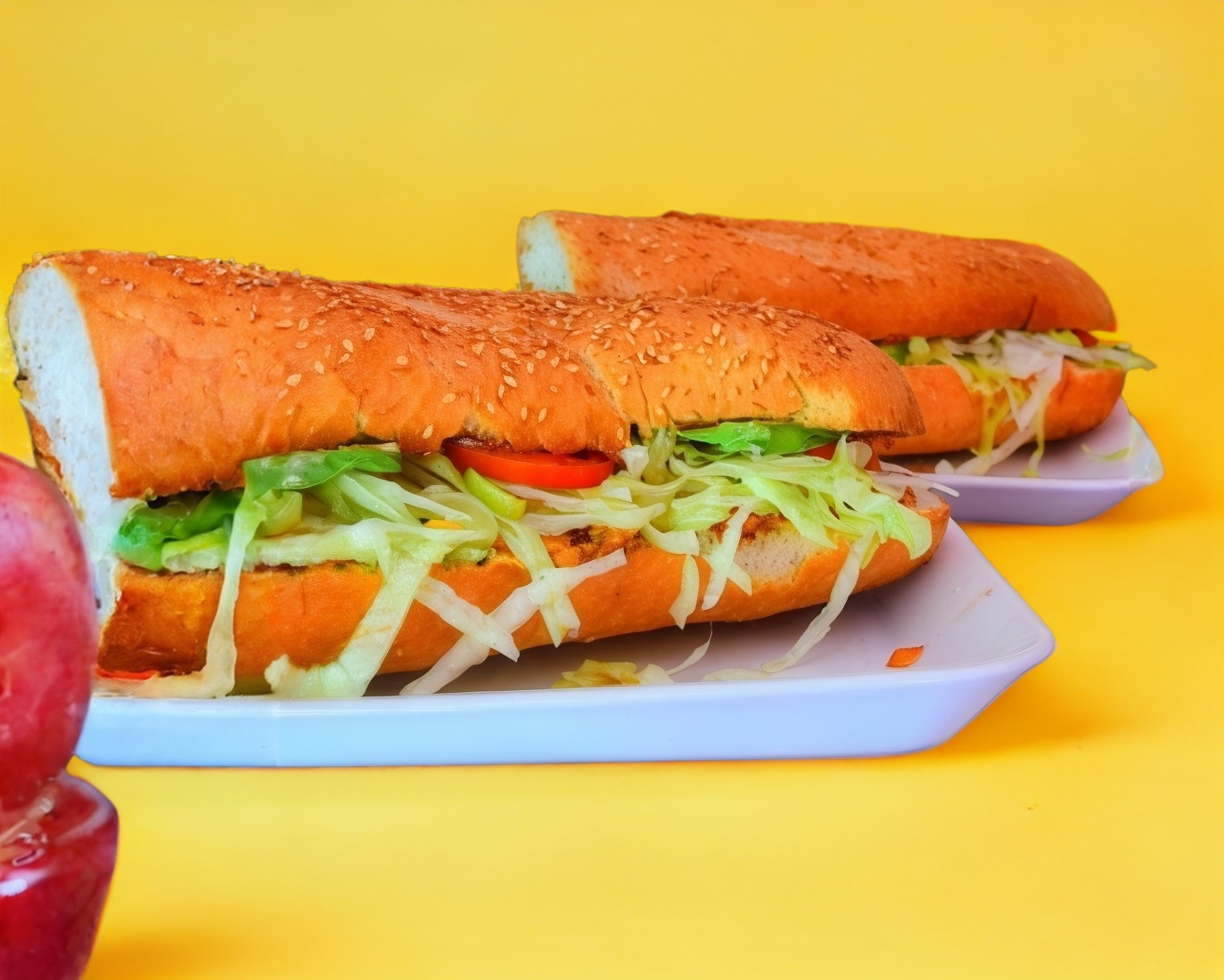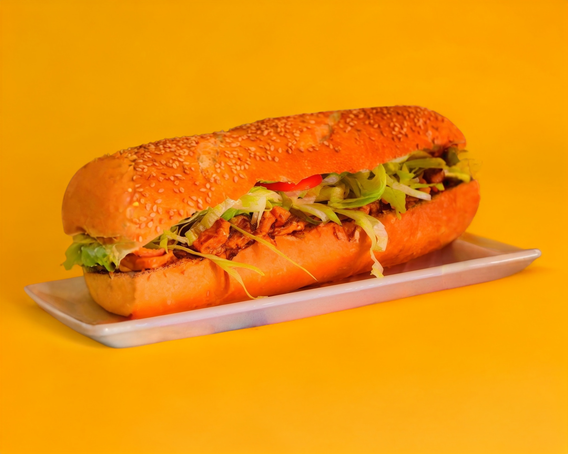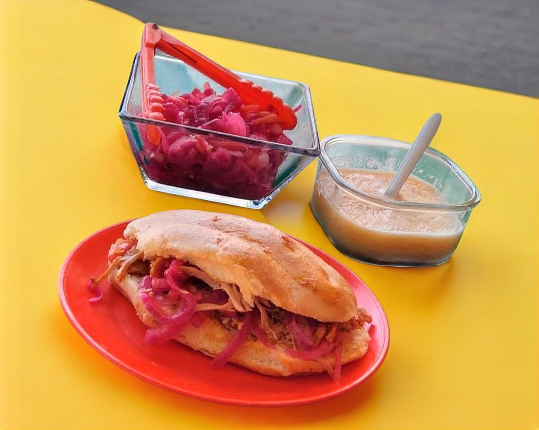 Pan de telera, Cochinita Pibil, Doradita en el horno, (acompañado de cebolla morada y salsa habanera van por aparte)