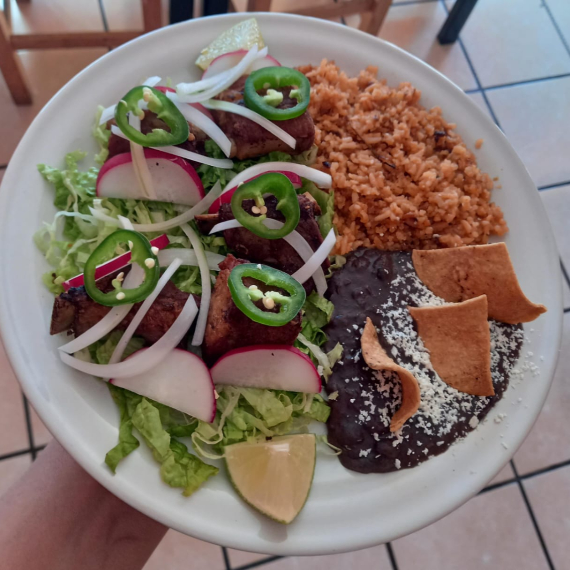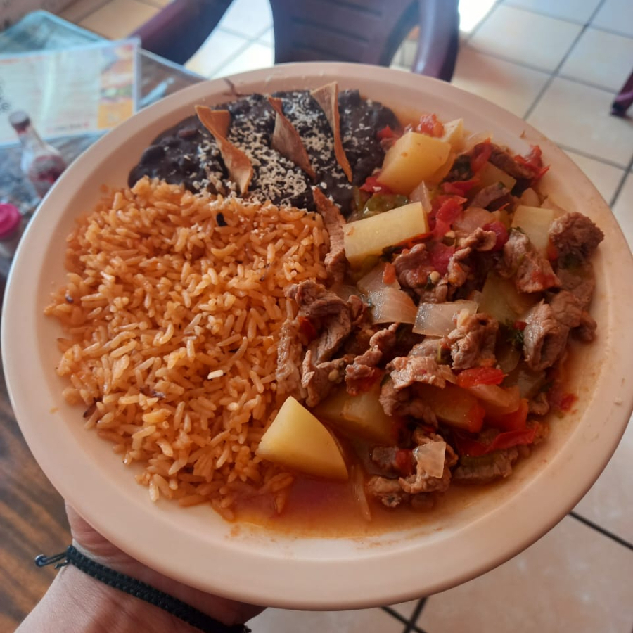 Jugosos cortes de res guisados con tomate, cebolla y chile jalapeño con frijoles y arroz.