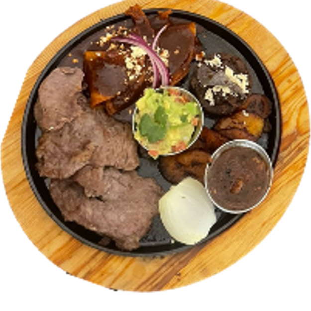 Arrachera 180gr acompañada de enchilada de mole, frijol frito, platanitos, cebolla asada y guacamole.