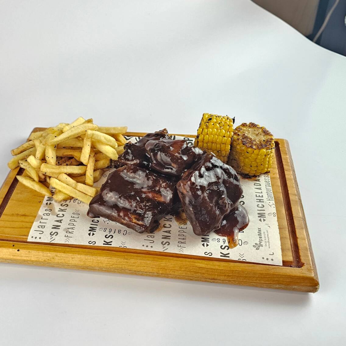Costillitas a la BBQ acompañanas de Papas y Elote Americano