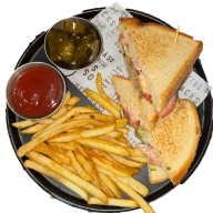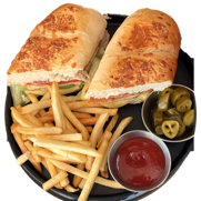 Baguette con jamón, tocino, pimiento morrón, tomate, cebolla asada a la plancha, queso manchego gratinado y papas a la francesa.