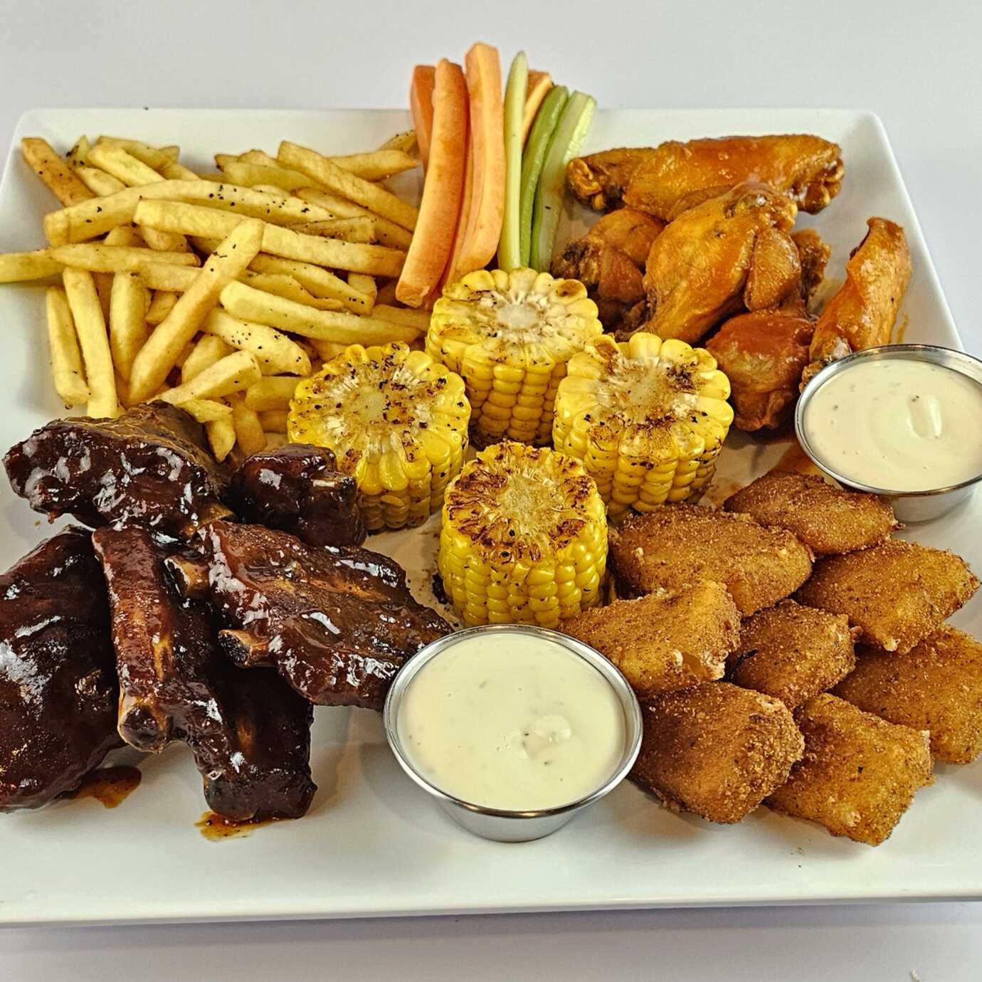 Para 3 Personas, costillitas BBQ, Alitas o Boneless, Dedos de Queso, Elote Americano, Papas a la Francesa y Palitos de Apio y Zanahoria.