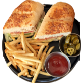 Baguette con jamón, tocino, pimiento morrón, tomate, cebolla asada a la plancha, queso manchego gratinado y papas a la francesa.