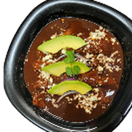 4 Tortillas amarillas rellenas de pollo guisado, bañadas en mole chiapaneco y espolvoreadas con crema y queso.