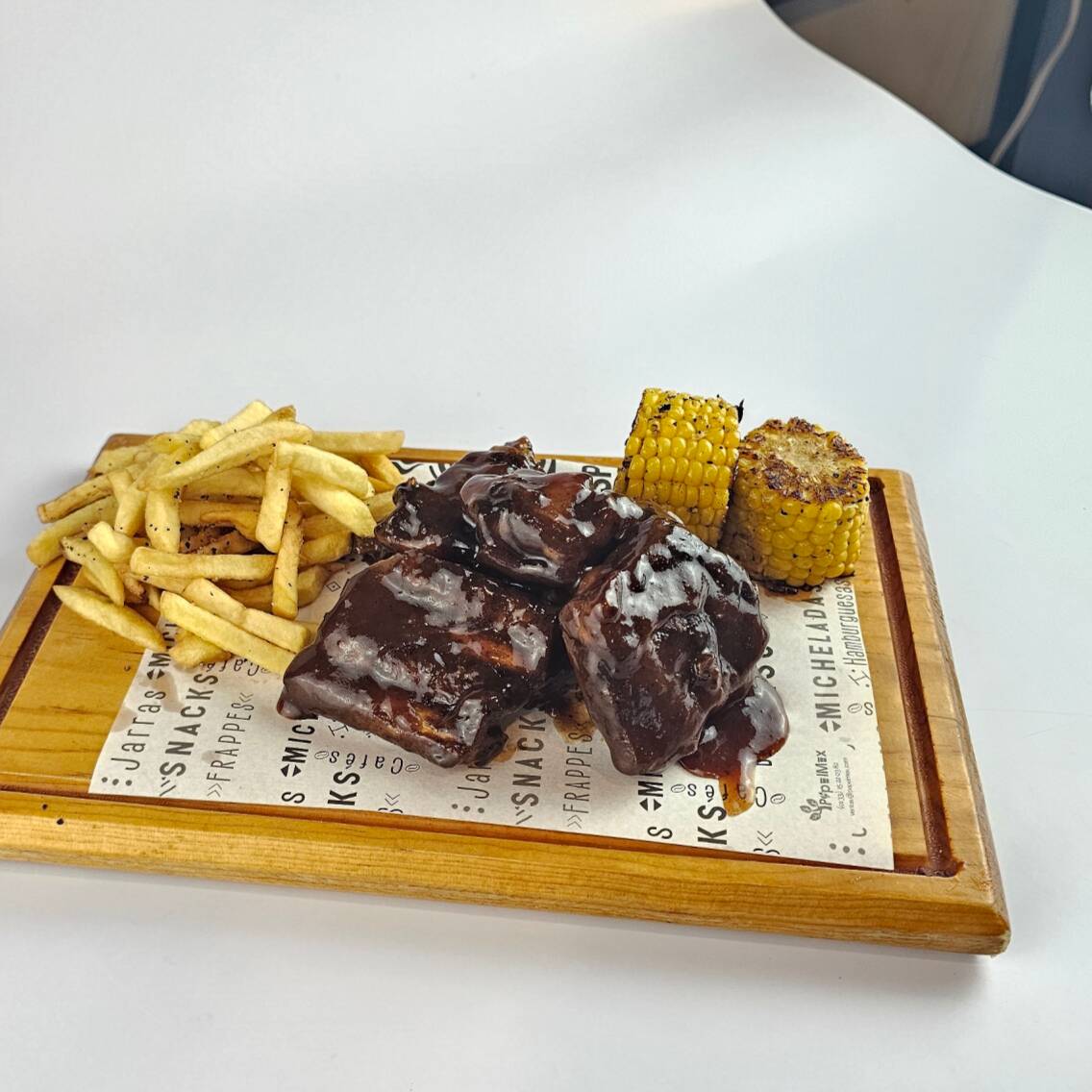 Costillitas a ala BBQ acompañadas de Papas a la Francesa y Elote Americano