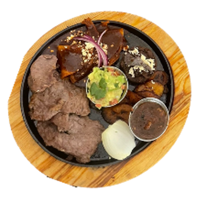 Arrachera 180gr acompañada de enchilada de mole, frijol frito, platanitos, cebolla asada y guacamole.