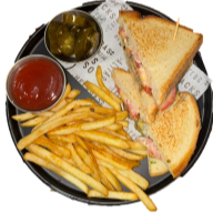 Pechuga de pollo a la plancha, queso manchego, tomate, cebolla sazonada, aguacate y lechuga. Acompañado de papas a la francesa.