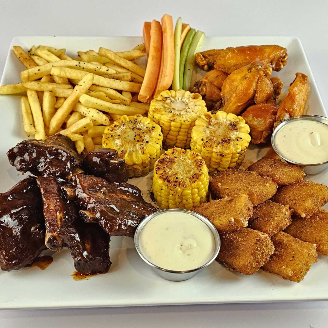 Para 3 Personas, Costillitas BBQ, Alitas o Boneless, Dedos de Queso, Papas a la FRancesa y Palitos de Apio y Zanahoria.