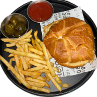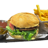 Carne molida, con aros de cebolla, tocino, queso manchego, queso amarillo, jamón, tomate, cebolla y lechuga. Acompañado de papas a la francesa.