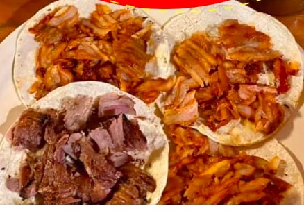Deliciosa carne de chuleta preparado con chile morrón,cebolla y tocino acompañado de cuatro tortillas)