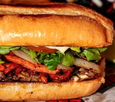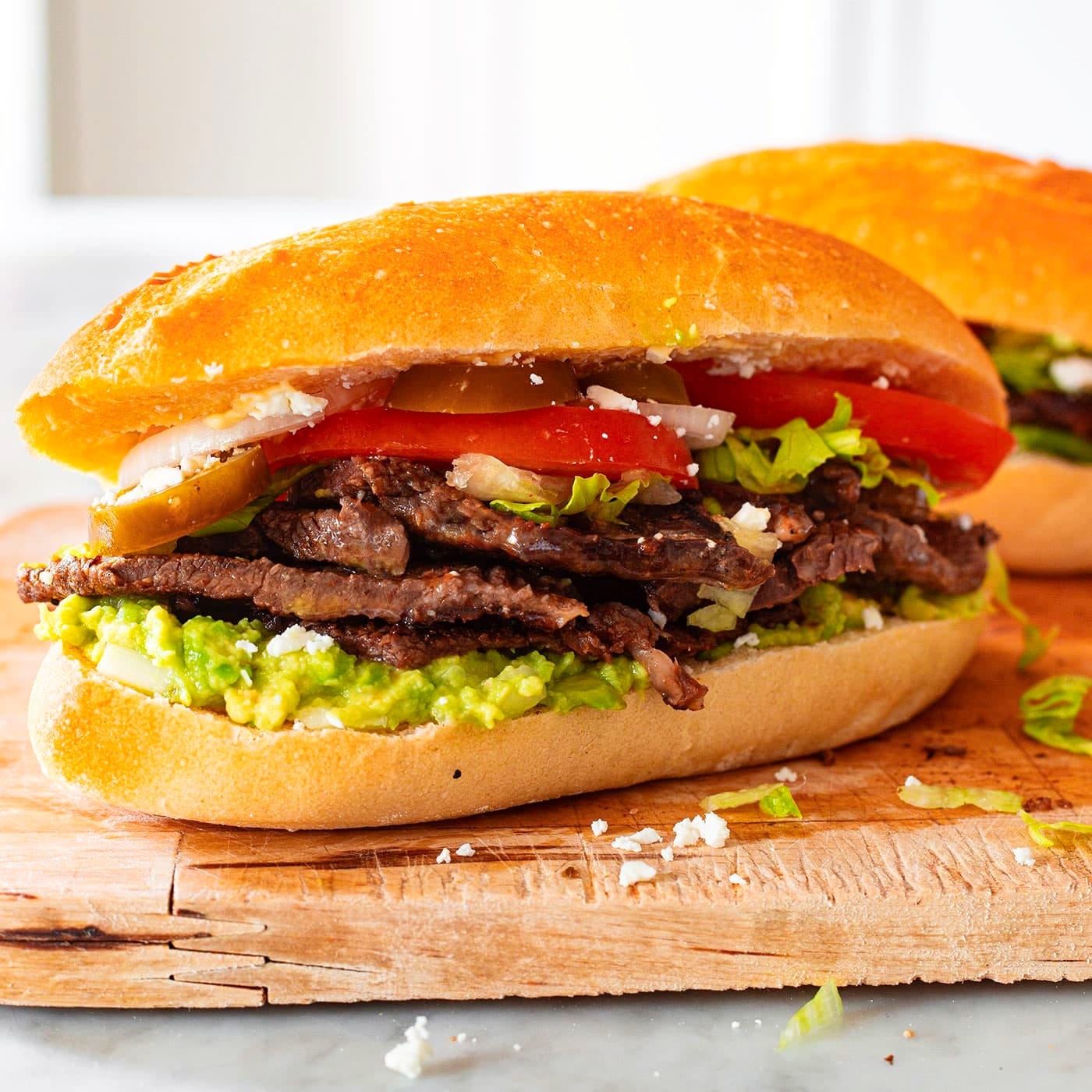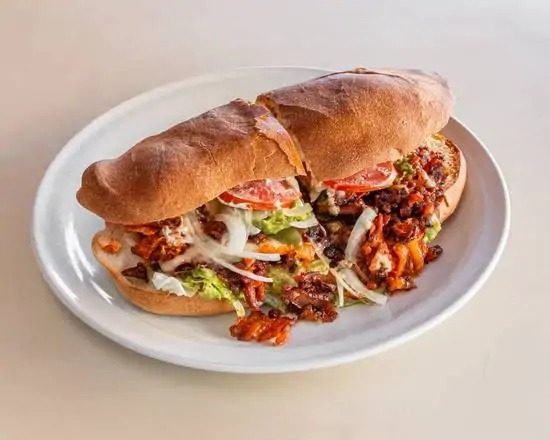 Carne al pastor, lechuga, tomate, cebolla, pan telera y queso opcional.