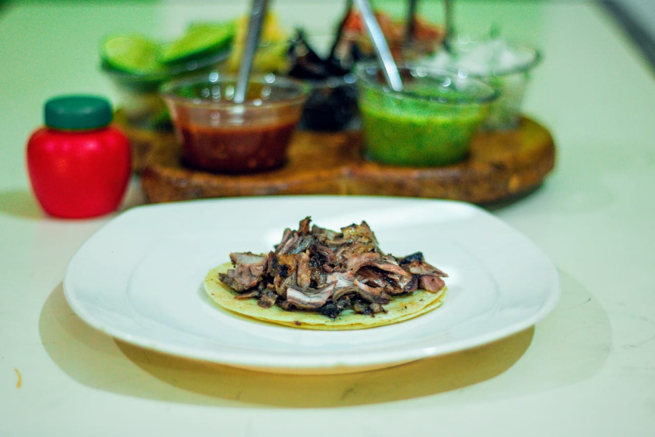 100 g de carne al pastor 100 g de chuleta Cebolla fresca, cilantro y limones De 10 a 15 tortillas (aproximadamente) Salsa verde al gusto