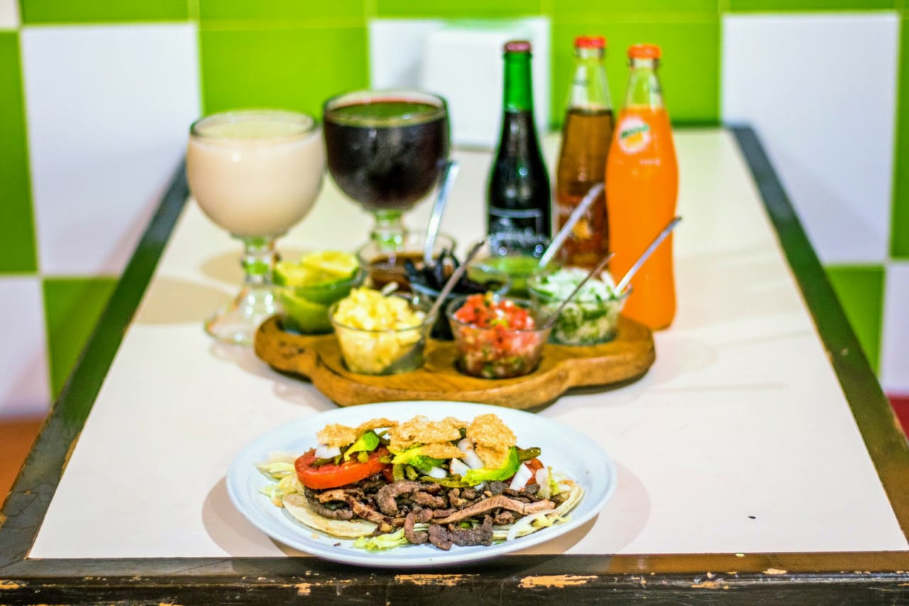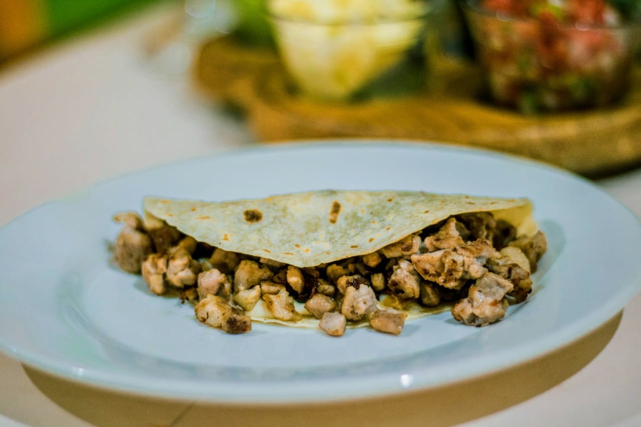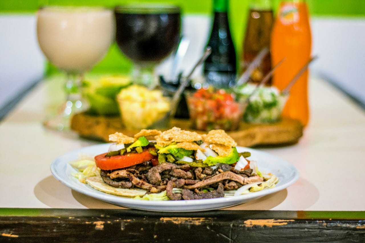 Tortilla, chuleta, bistec, chicharrón, nopalitos, aguacate, lechuga, tomate y cebolla.
