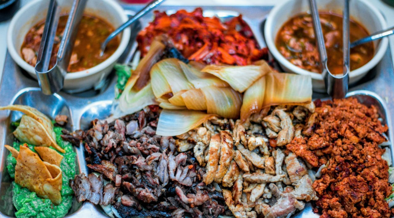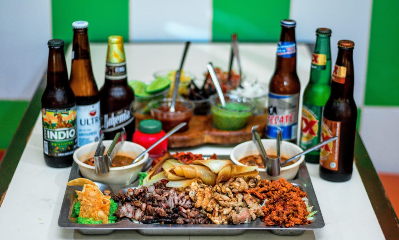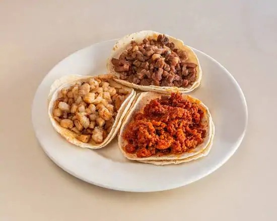 Porcion personal: Taco surtido “4 carnes” 50 g de pastor, 50 g de chorizo, 50 g de sirloin y 50 g de chuleta. Acompañado de cebolla asada, tortilla de maíz, salsa verde, cilantro, cebolla fresca y limón