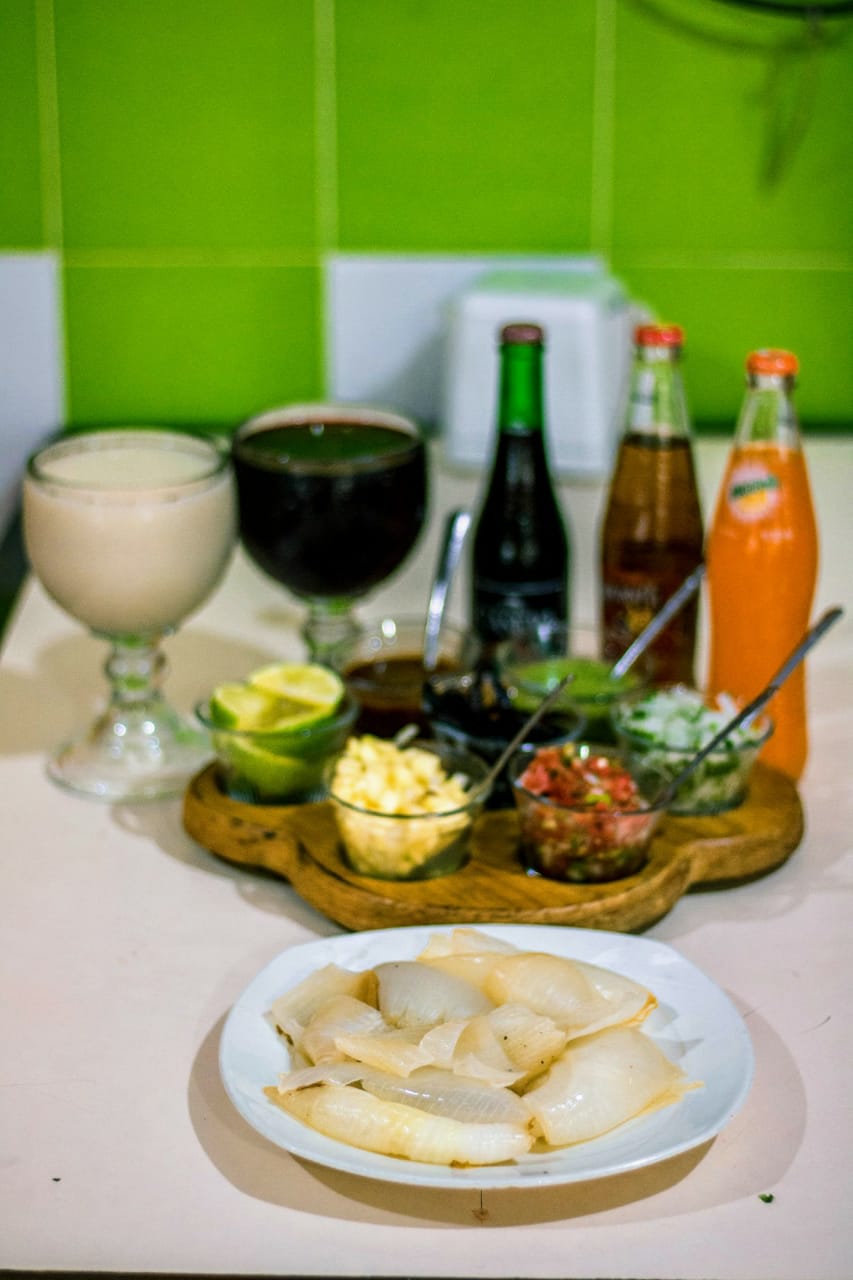 Cebolla asada, ensalada, tortillas, cebolla, cilantro, salsa y limones.