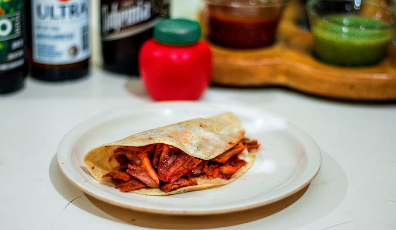 Viene 2 tacos de carne de pastor, jamón, tocino, queso, salsa mexicana que contiene tomate rojo, cebolla, cilantro, sal y limón.