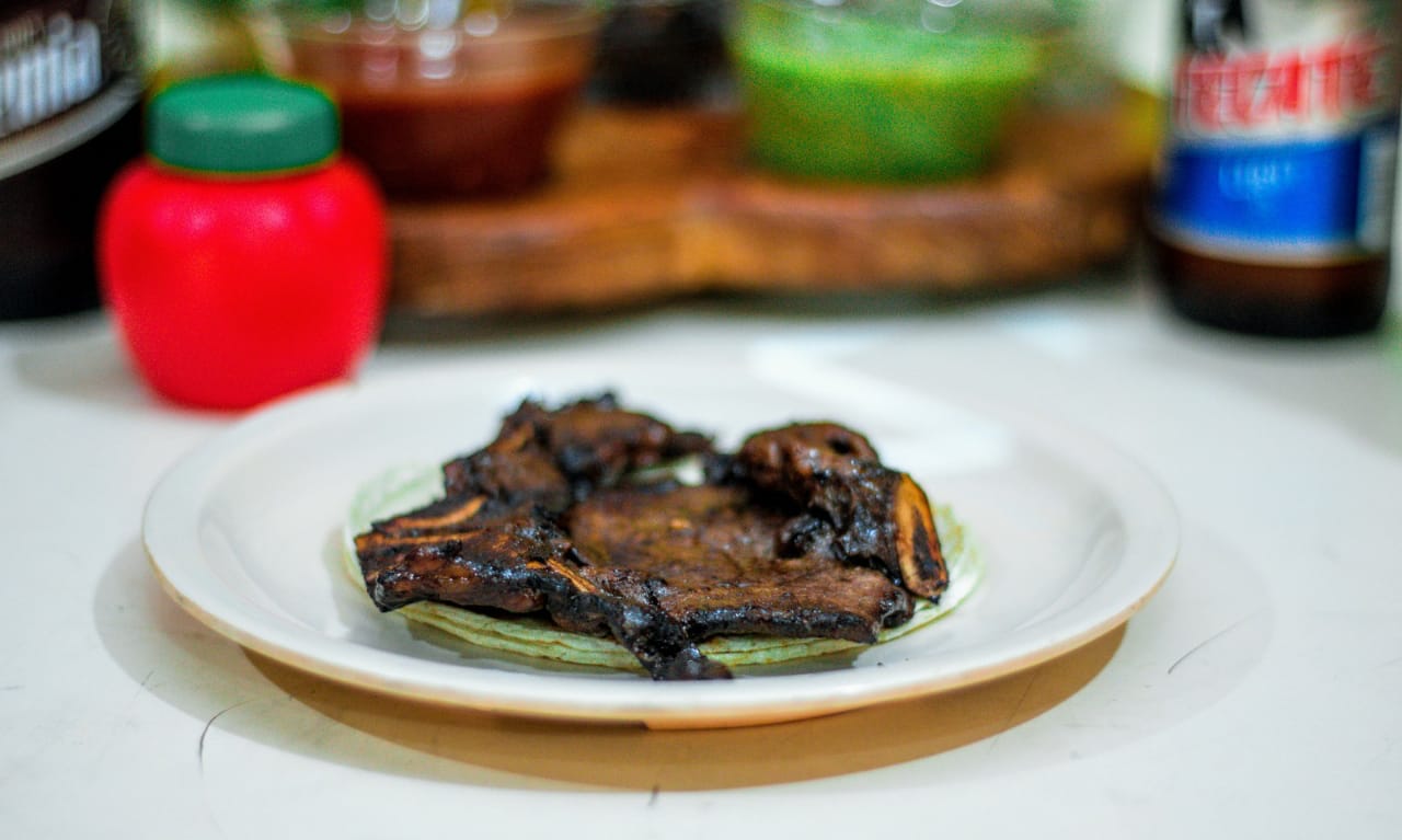 Una porción, carne de sirloin, tortilla de maíz (2 piezas), aparte cebolla, cilantro, salsas y limones.