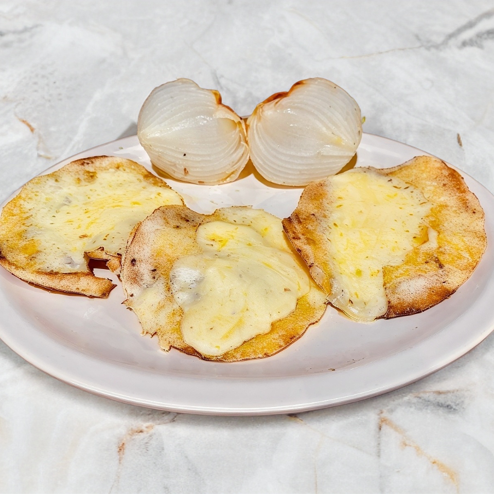 Una Tortilla de maíz dorada con queso gouda gratinado