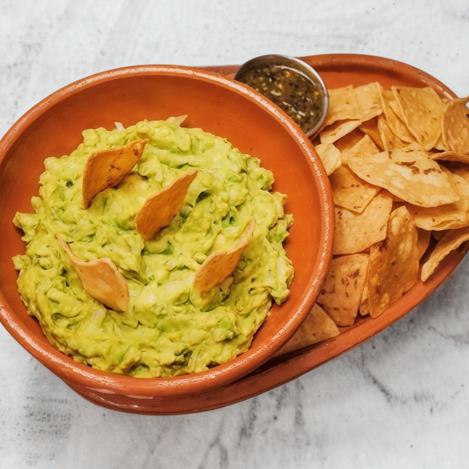 Aguacate, cebolla, cilantro y totopos