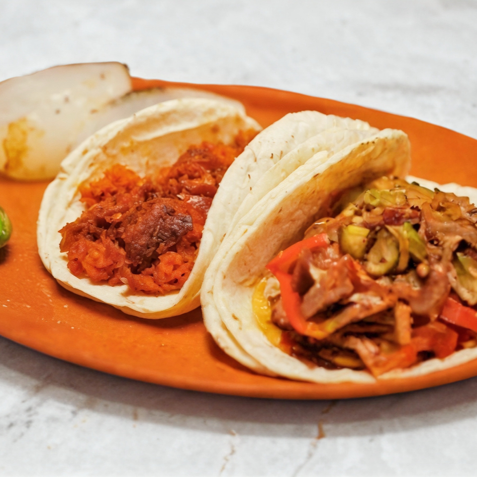 Tortilla de maíz con carne de chorizo tradicional(complementos salsa vede de aguacate, salsa roja molcajeteada, limones y cebolla y cilantro )