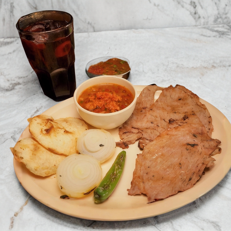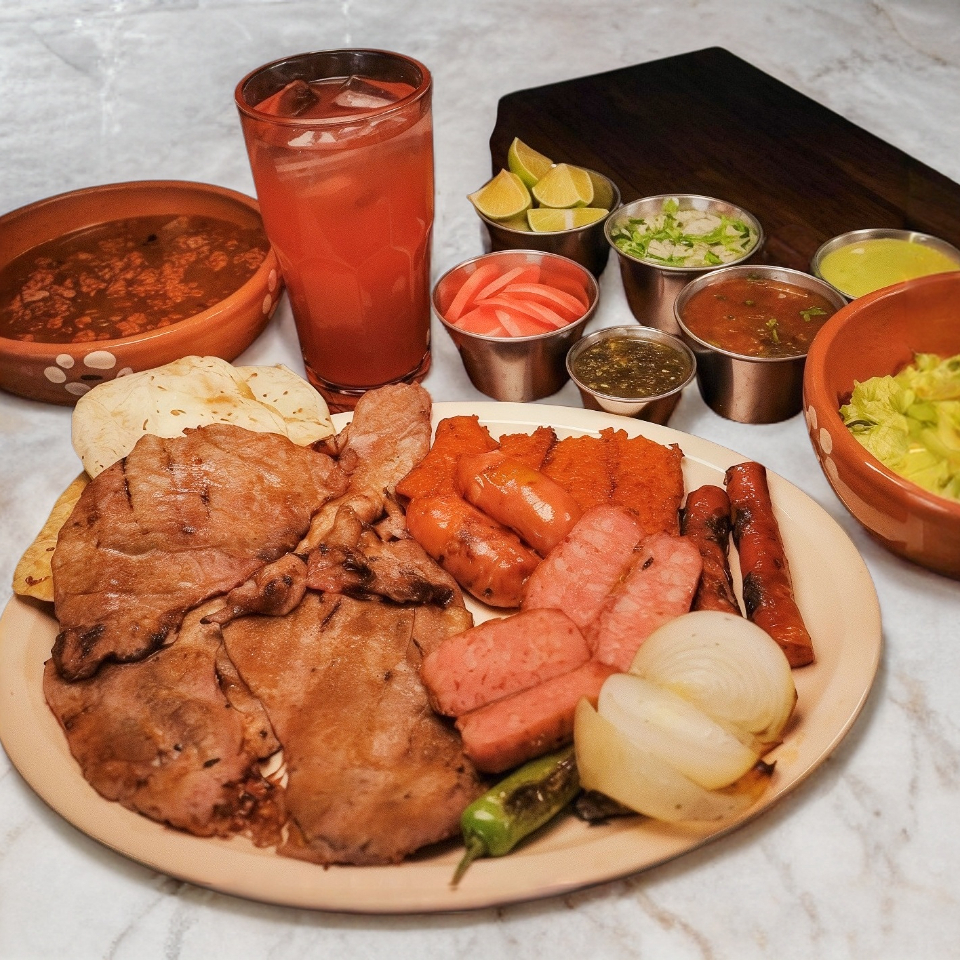 Filete de sirloin , chistorra, chorizo tradicional, chorizo argentino, chile toreado, cebolla azada , tortillas de maíz, frijoles charros y quesadilla sencilla